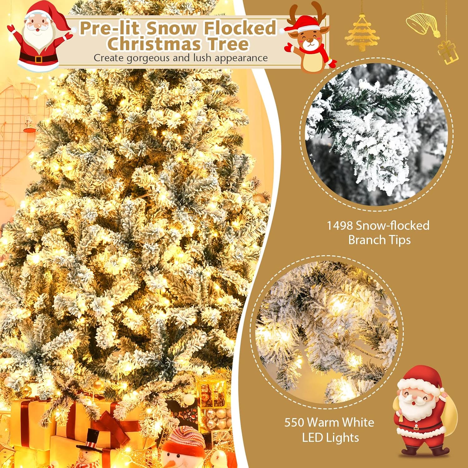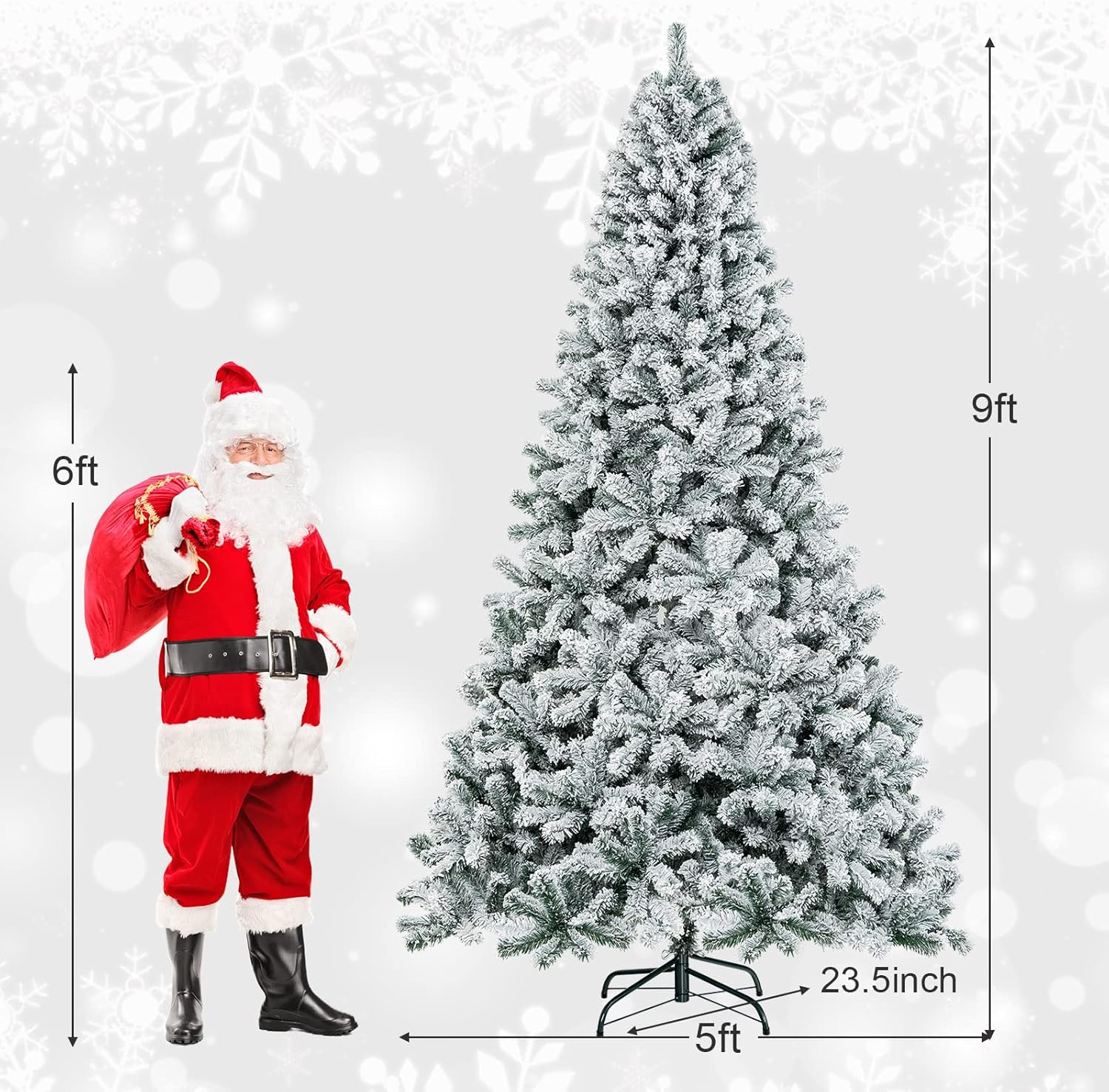Description:Enjoy your Christmas with this snow flocked Christmas artificial tree.Choose different kinds according to your various needs. Just decorate it now!Prelit Design in 4.5/6/7.5/9 FtUnlit Design in 6/7.5/9 FtFeatures:Snow flocked realistic Christmas tree brings you pleasant holiday enjoyment4.5/6/7.5/9 Ft with pre-lit or unlit Christmas tree for you to choose295/600/1010/1498 dense branch tips to decorate your favorite treePre-lit design with 150/250/450/550 LED lights for charming holiday atmosphereConstructed in 3 or 4 sections for convenient set up or storage in the bagHigh quality PVC needles is non-flammable and safeStable metal base for stronger support of the whole treeBase foldable design for quick storageSuitable for home, garden, office, holiday party, shop, hotel, universitySpecification:Color: White (Pre-lit)/Green (Unlit)Materials: PVC, MetalHeight: 4.5/6/7.5/9 FtOverall Dimension: 28.8'' x 54''/36'' x 72''H /51.6'' x 90''/96'' x 108'' (D x H)Number of Tips: 295/600/1010/1498Number of Lights: 150/250/450/550Net Weight: 7/12.8/24/33 lbsPackage Includes:1 x Christmas tree1 x Metal Stand 1 x Instruction