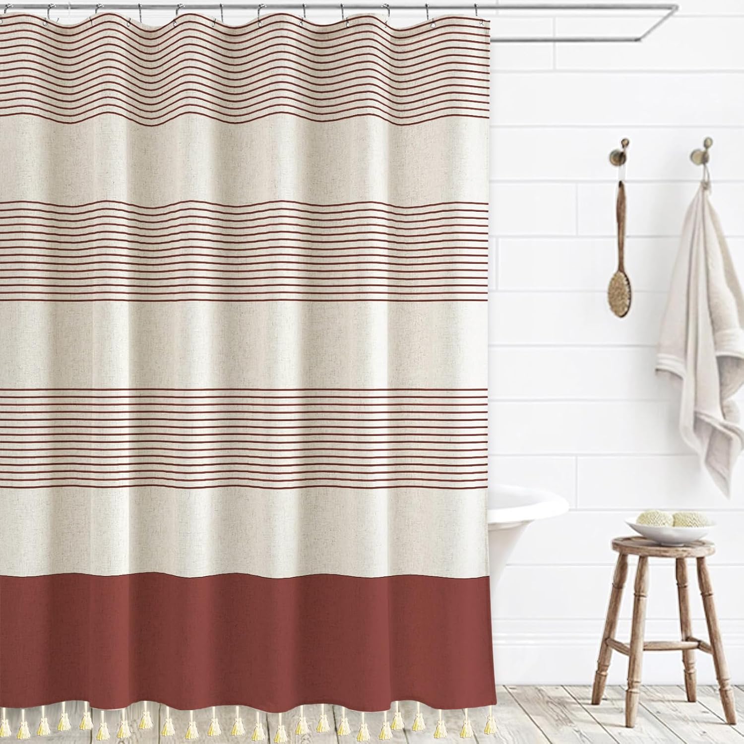 Linen fabric with beige fringe at bottom and striped print